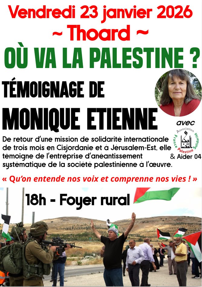 Où va la Palestine ? témoignage de Monique Etienne Vendredi 23 janvier à 18h